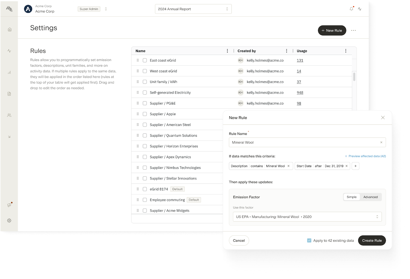 The rules governing emissions factor assignments often live in spreadsheets, and are applied manually to each new row of activity data. Gravity’s new Rules feature complements the platform’s existing emission factor automations by allowing users to configure custom rules and apply them across the inventory at scale: