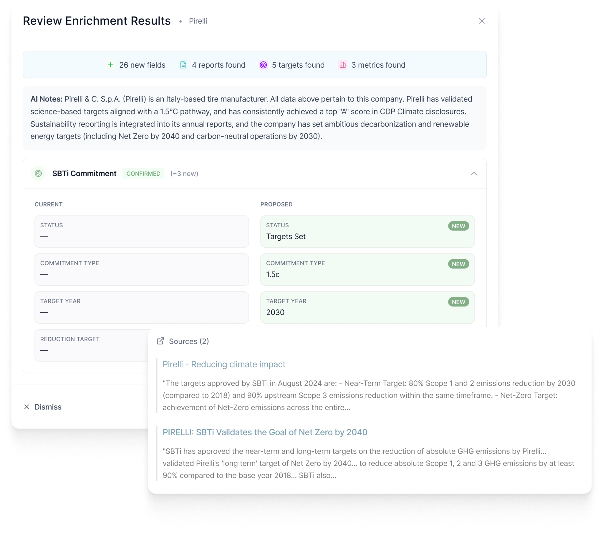 - Review each AI-enriched datapoint in a supplier profile, with the ability to check sources and edit information before accepting changes