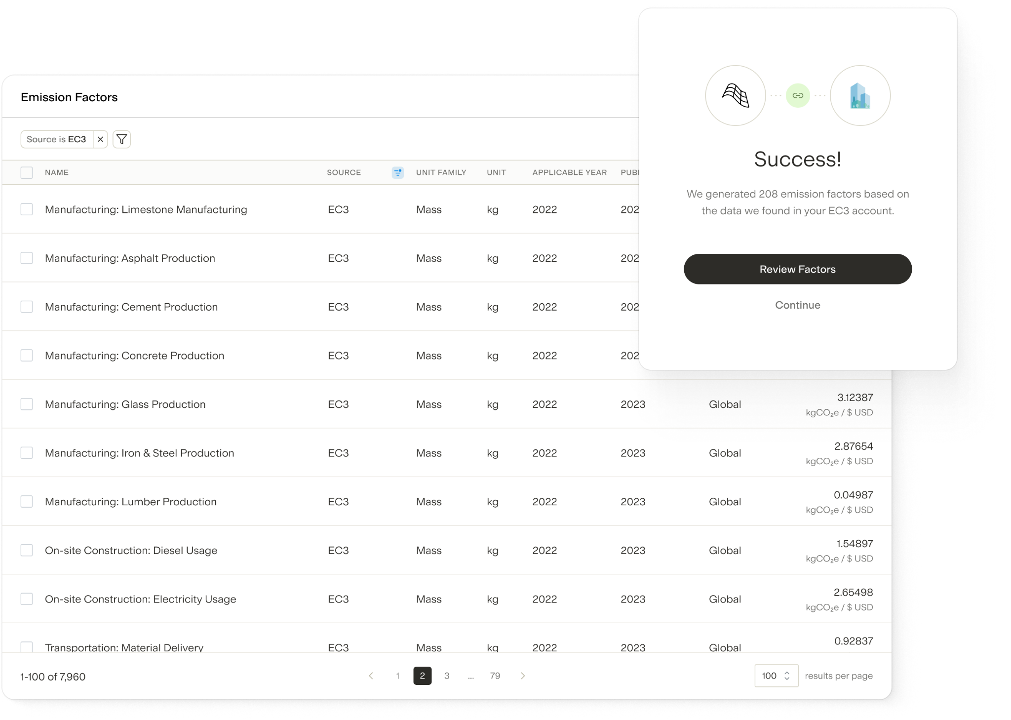 - Automatically generate a custom emissions factor from the EC3 data, including name, CO₂e quantity, and region